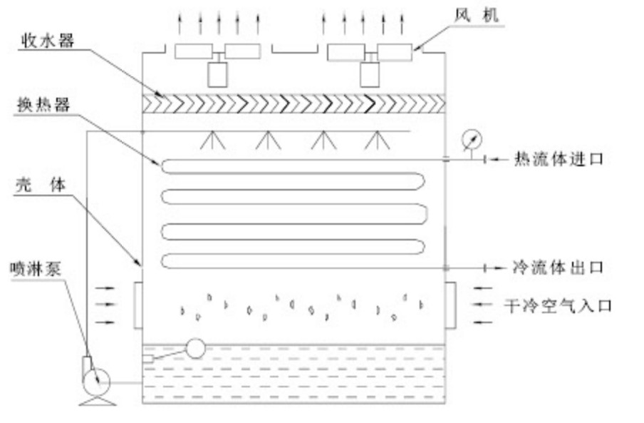 工作時(shí),載熱介質(zhì)(冷卻水、油或其他液體)由系統(tǒng)循環(huán)泵驅(qū)動(dòng),在換熱器盤管內(nèi)及需冷卻設(shè)備(如∶電源、爐體等)之間循環(huán)流動(dòng),載熱介質(zhì)熱量向盤管管壁傳導(dǎo)。噴淋水均勻地噴灑在換熱器上,在換熱器盤管外表面形成均勻的水膜。在風(fēng)機(jī)的作用下,冷空氣由塔體下方的進(jìn)風(fēng)口進(jìn)入塔內(nèi),與噴淋水逆流經(jīng)過(guò)換熱器表面,充分接觸,并進(jìn)行潛熱和顯熱交換,部分水蒸發(fā),使噴淋水溫降低,吸收熱量后的飽和濕熱空氣由風(fēng)機(jī)排至大氣中,低溫噴淋水吸收盤管熱量后流入塔體下部水槽,再由噴淋泵再輸送至噴淋系統(tǒng)。如此往復(fù),換熱器內(nèi)的載熱介質(zhì)得到降溫冷卻。在熱交換過(guò)程中,盤管內(nèi)的載熱介質(zhì)因?yàn)闆](méi)有與空氣直接接觸,使得品質(zhì)特性得以保持,不會(huì)污染、濃縮、吸濕及揮發(fā)。